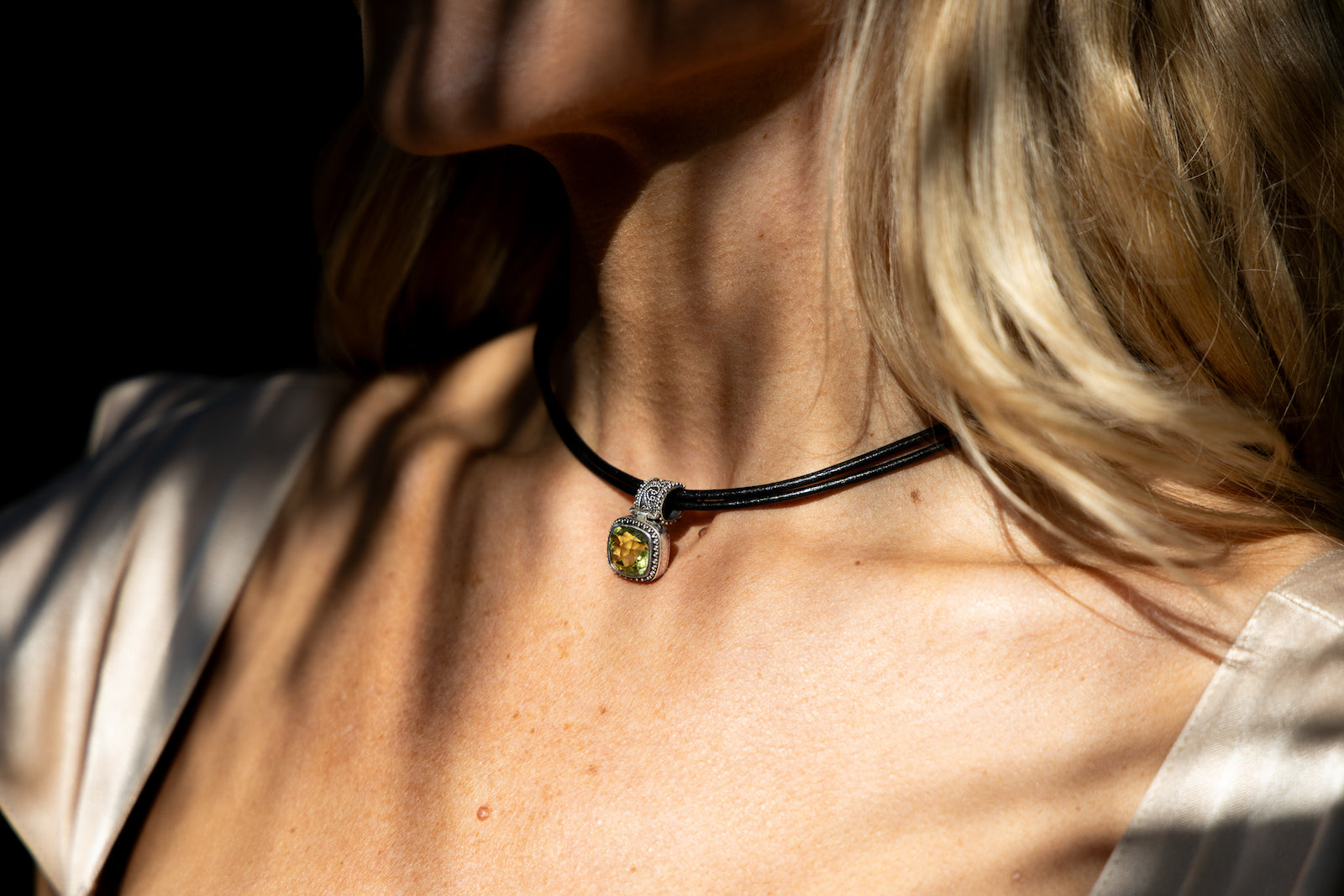 A cushion-cut Oro Verde quartz—our original name for lemon quartz—takes center stage in this simple yet striking pendant. Set in a handcrafted sterling silver bezel and strung on a soft leather choker, it’s a sunlit piece with just the right edge.